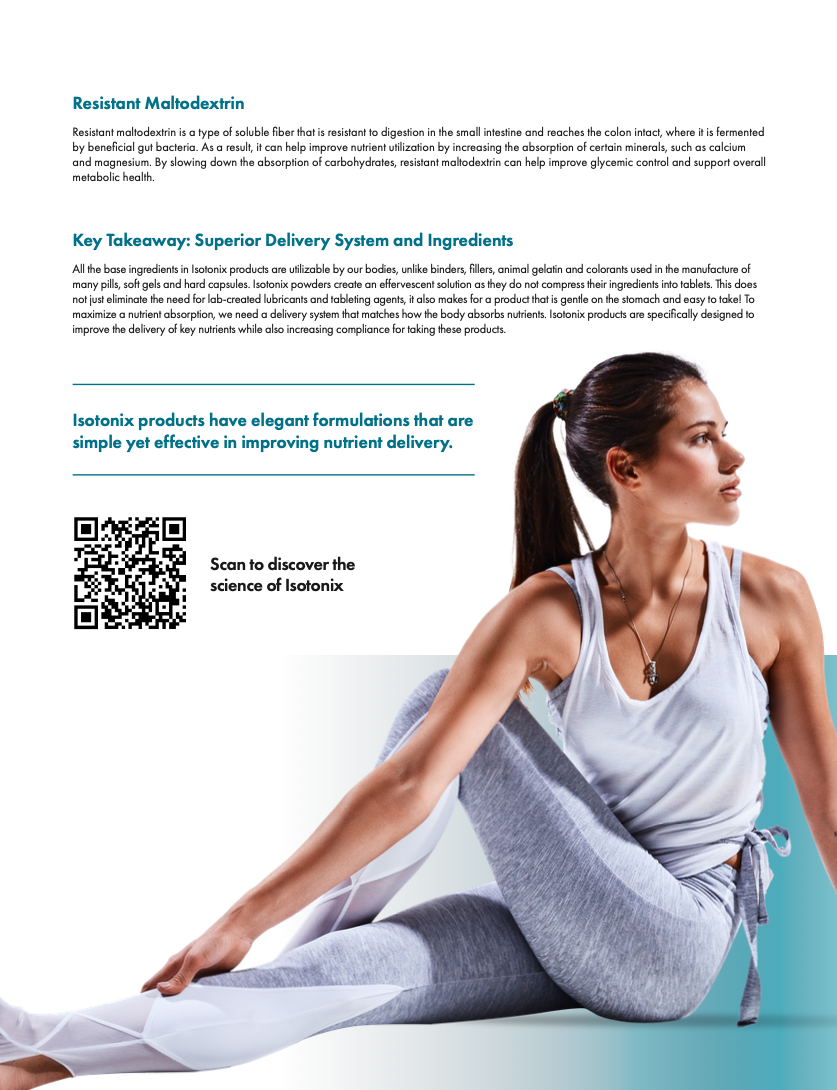 Isotonix products are powders without any of the binders, fillers, or coatings common to tablet manufacturing. As a result, the time & work necessary to absorb the supplement is greatly reduced.